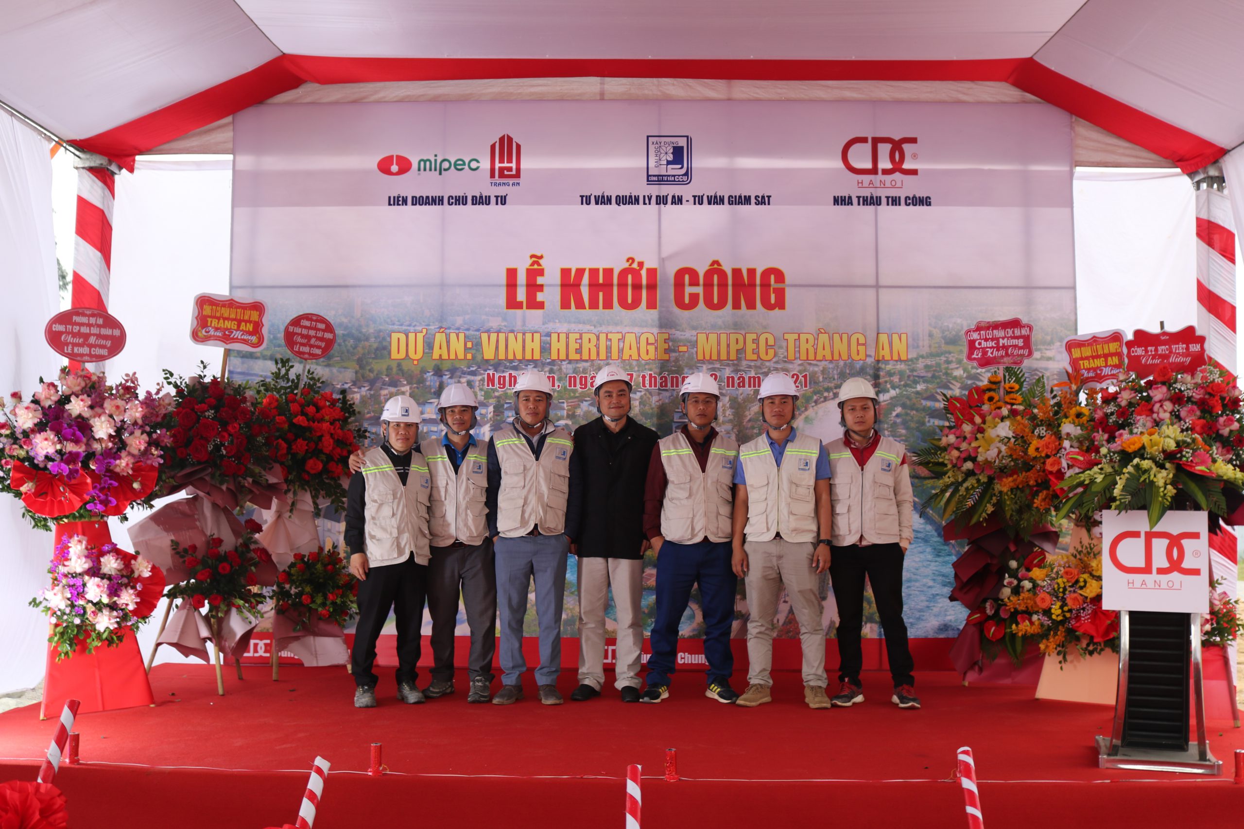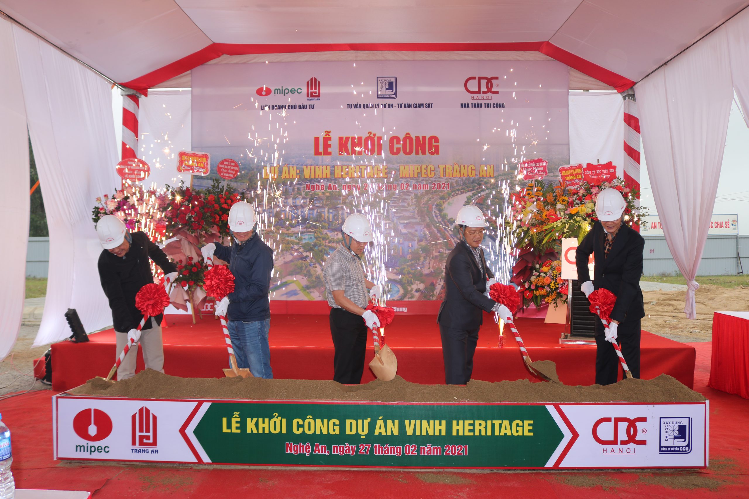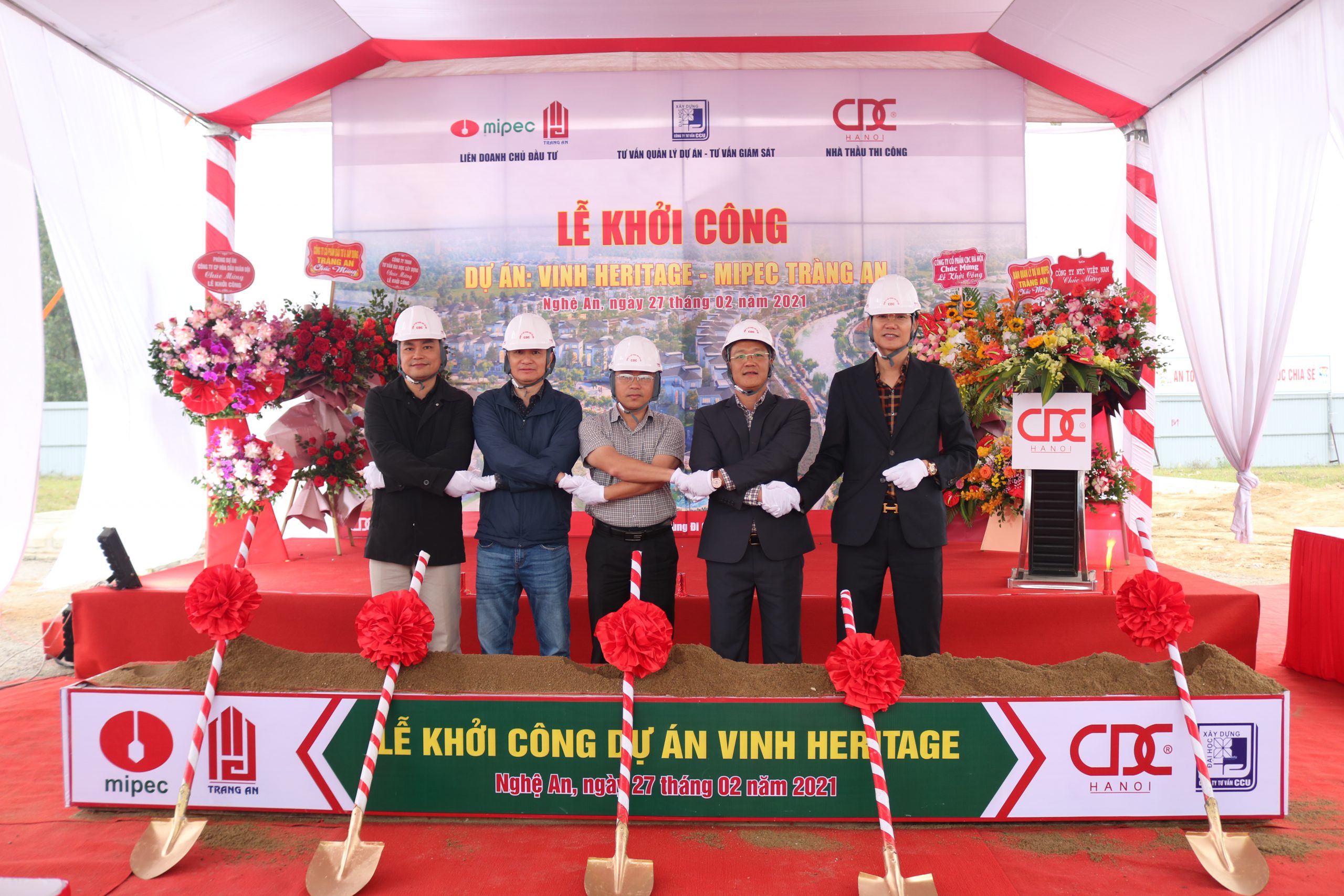 On February 27, 2021, CDC Ha Noi Joint Stock Company successfully organized the groundbreaking ceremony for the “Vinh Heritage” project in Vinh Tan Ward, Vinh City, Nghe An Province. The ceremony was honored to welcome representatives from the investors, Mipec and Trang An, supervisory consultants, project management consultants, and CDC Ha Noi, along with key partners involved in the project